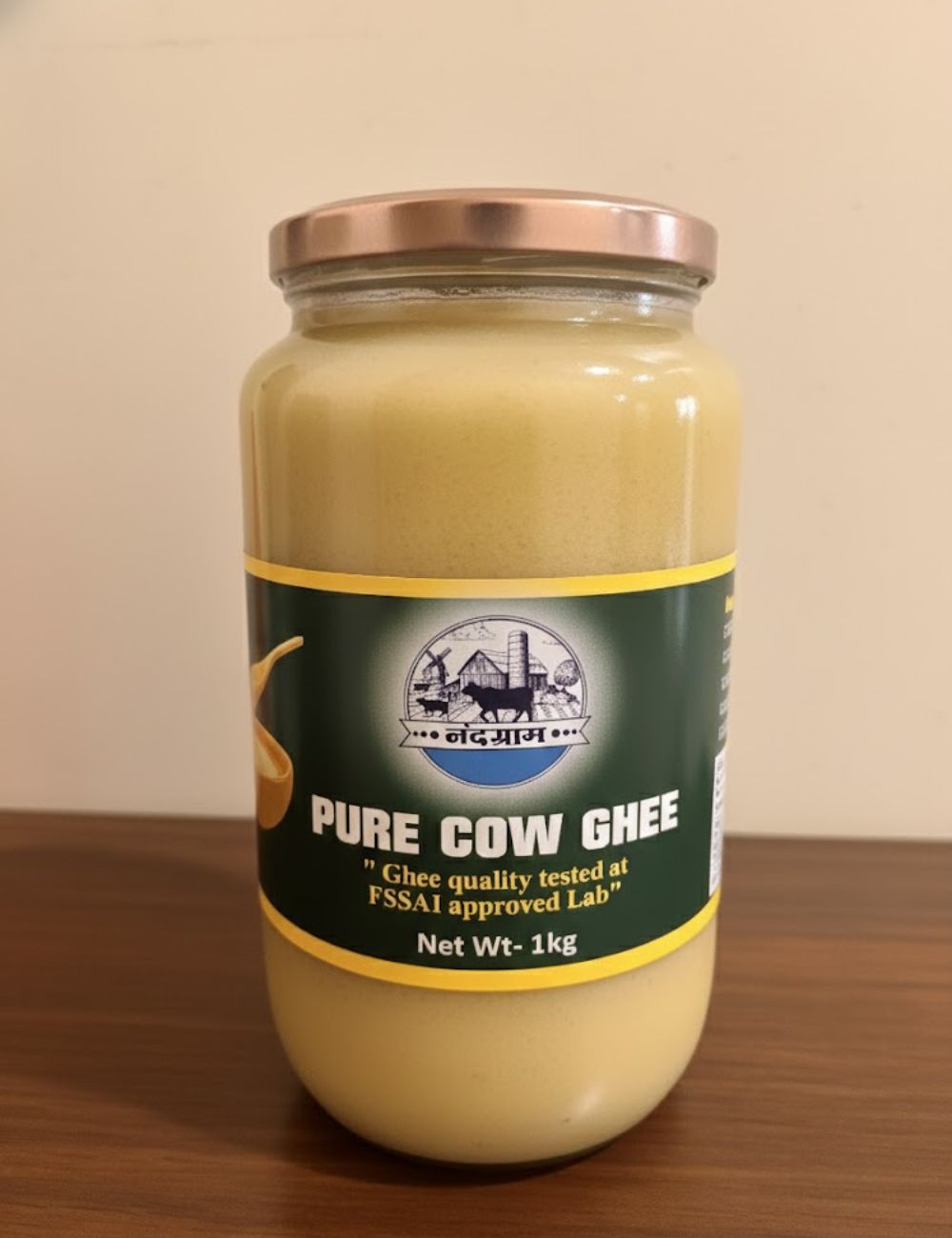 Nandgram Pure Cow Ghee is crafted with care on our own farm using milk from ethically raised, grass-grazing cows that live in a clean and open environment. We follow the traditional Bilona process, where curd is hand-churned to extract butter, which is then slowly heated to produce nutrient-rich ghee.